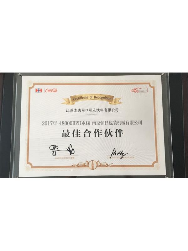 南京恒昌包裝作為后段整包商,在江蘇太古可口可樂48000bph水線項目中獲得“最佳合作伙伴”殊榮!